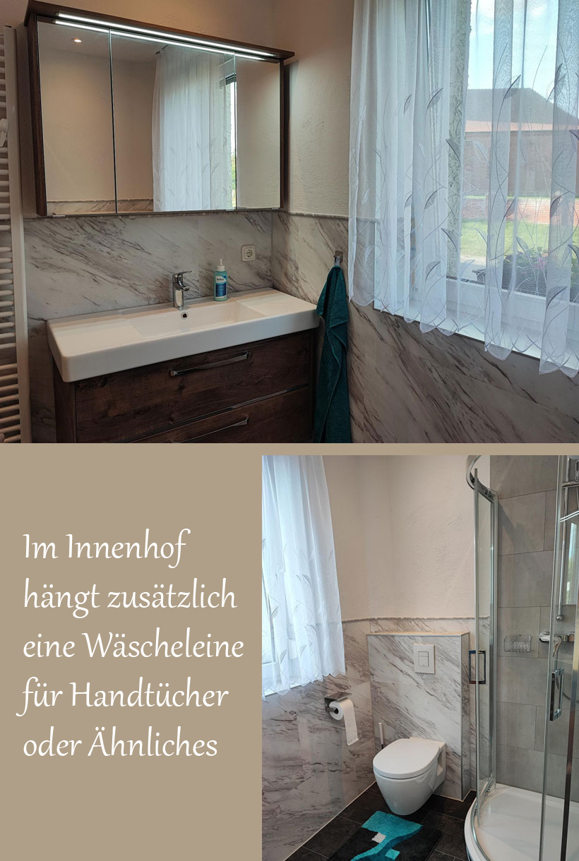 Bad: Dusche, WC, Föhn, jahreszeitenabhängig beheizbarer Handtuchtrockner